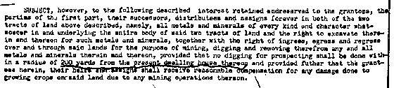 | "SUBJECT, however, to the following described interest retained and reserved to the grantors, the parties of the first part, their successors, distributes and assigns forever in both of the two tracts of land above described, namely, all metals and minerals of every kind and character whatsoever in and underlying the entire body of said two tracts of land and the right to excavate therein and thereon for such metals and minerals, together with the right of ingress, egress, and regress over and through said lands for the purpose of mining, digging and removing therefrom any and all metals and minerals therein and thereon, provided that no digging for prospecting shall be done within a radius of 200 yards from the present dwelling house thereon and provided further that the grantees herein, their heirs and assigns shall receive reasonable compensation for any damage done to growing crops on said land due to any mining operations thereon." |